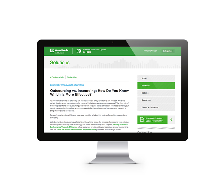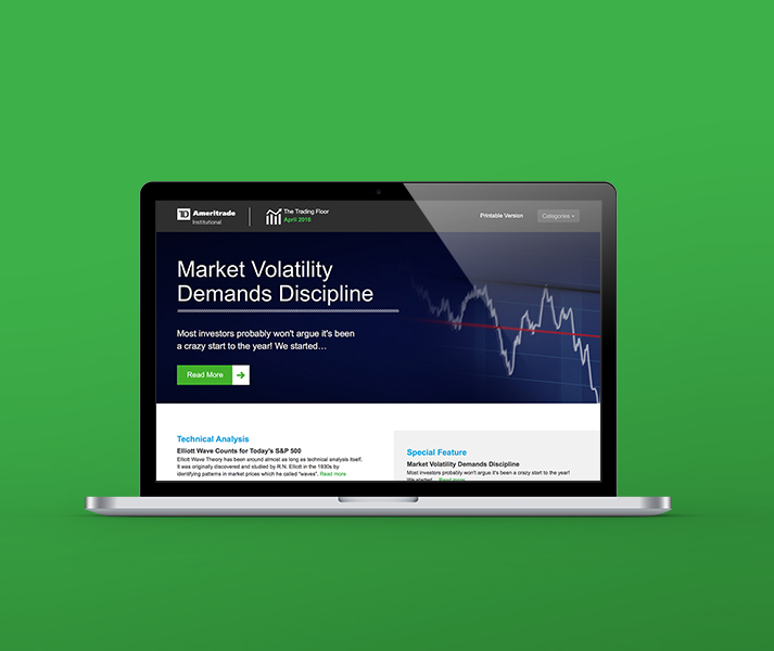As the lead designer for the TD Ameritrade Business Solutions Newsletter, I developed a complete suite of templates for web, email, and PDF formats. My goal was to create a consistent and professional experience across all channels, aligning with TD Ameritrade’s brand and communication standards.